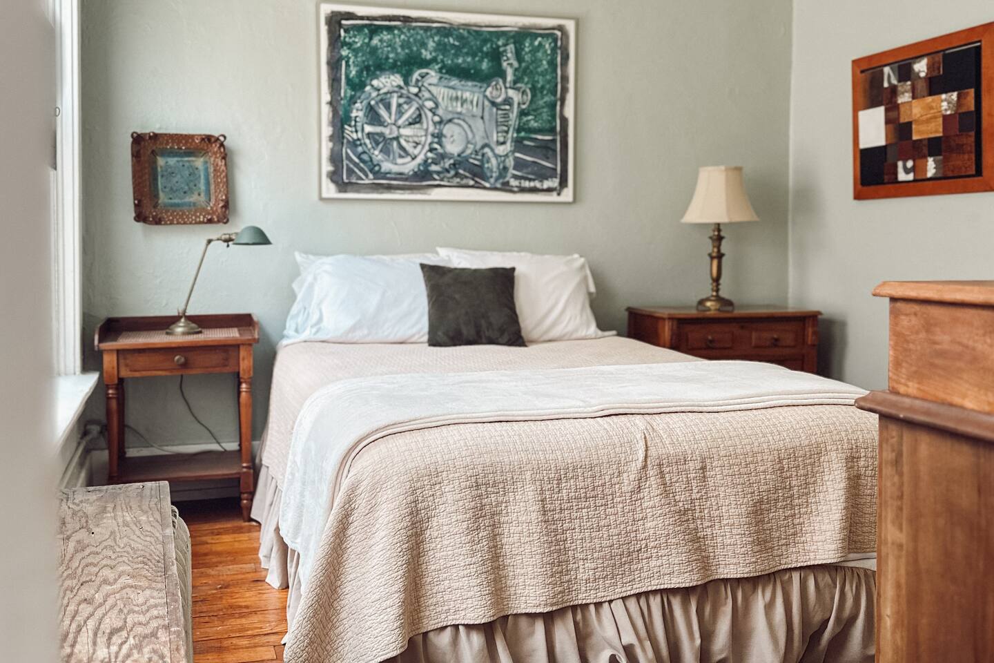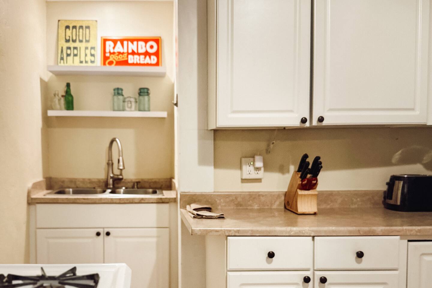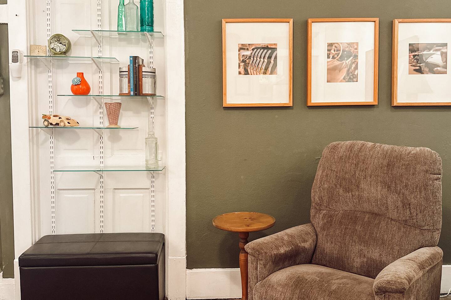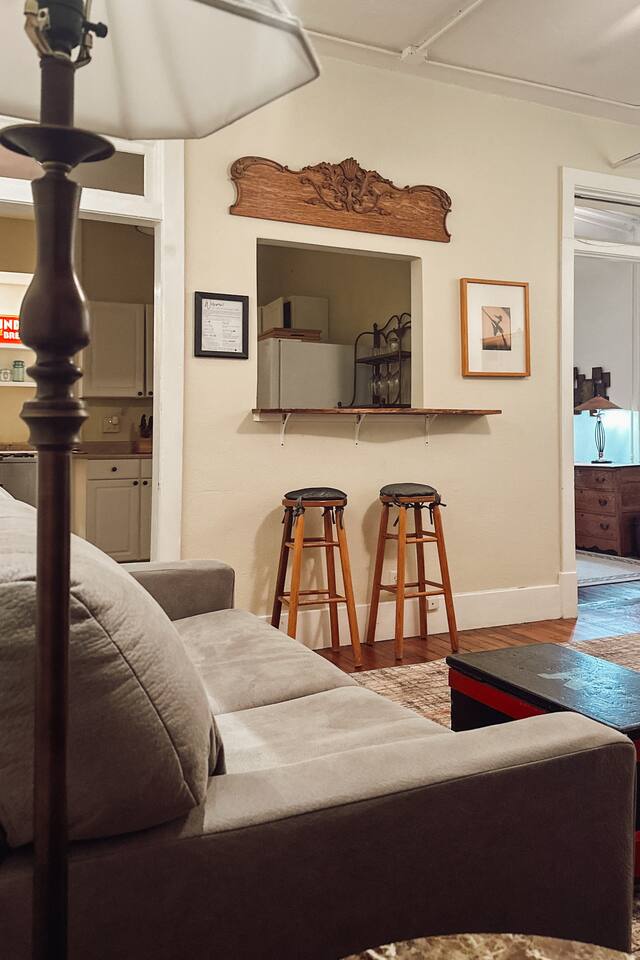 The Den is a 2nd story apartment in downtown Champaign located above the Hounds Rest pub. Please note that guests will need to be able to manage a flight of stairs to access this suite. This suite features 1 bedroom, 1 bathroom, a full kitchen, and a welcoming living room, totaling approximately 500 sq. ft.