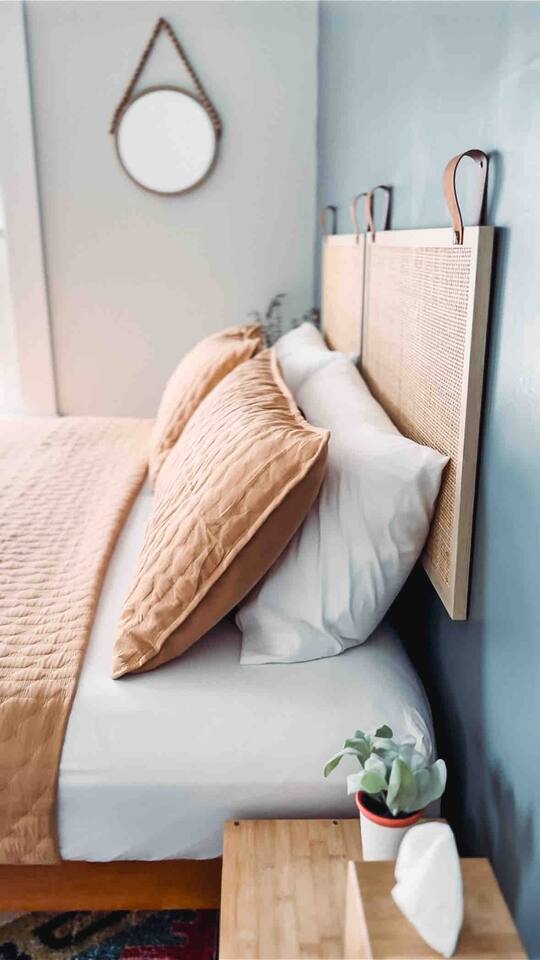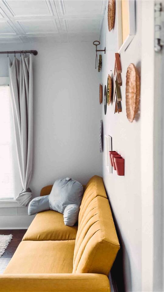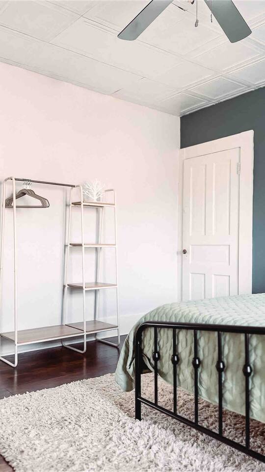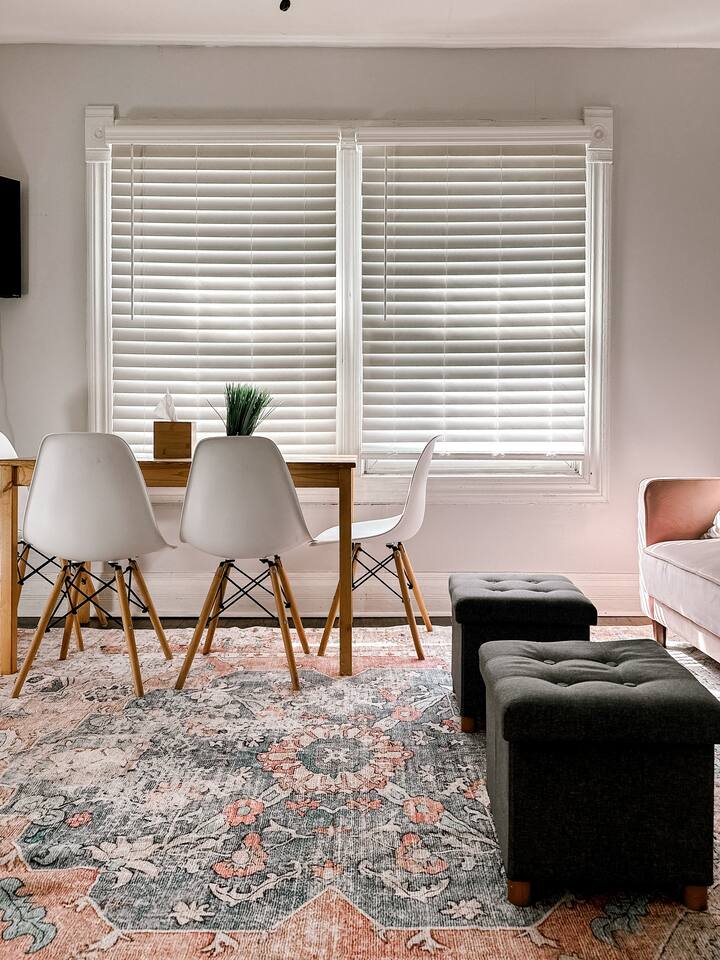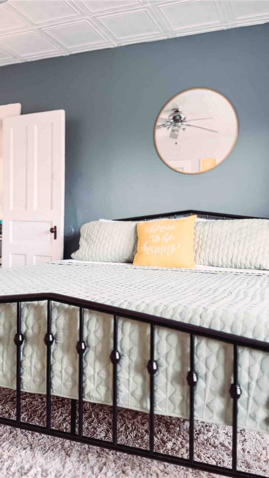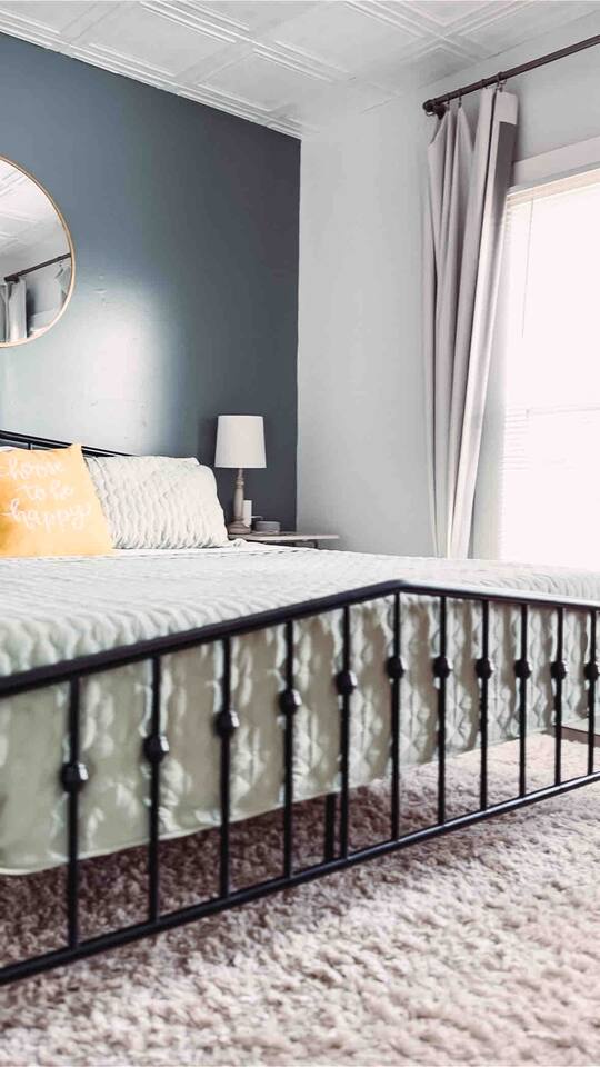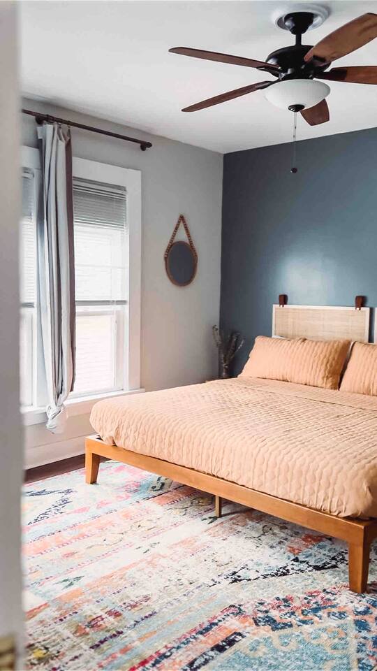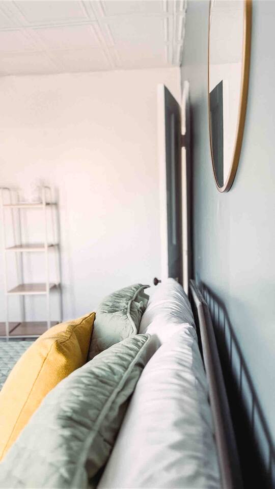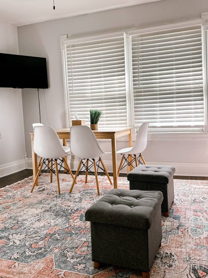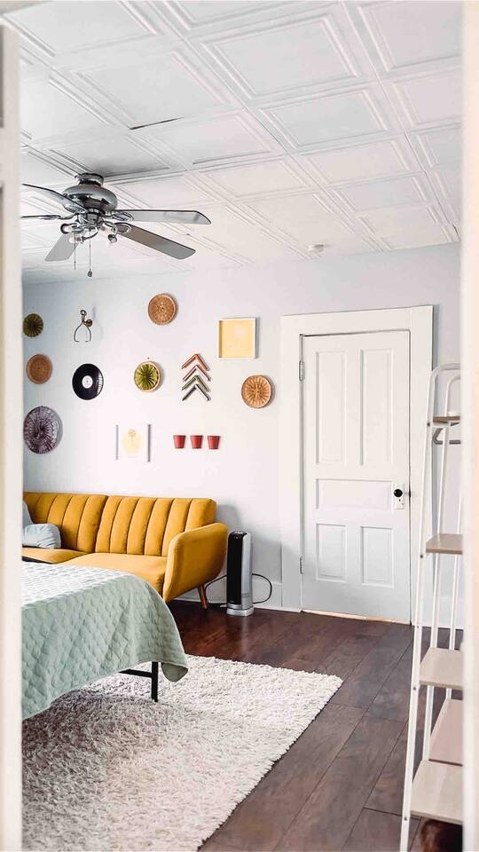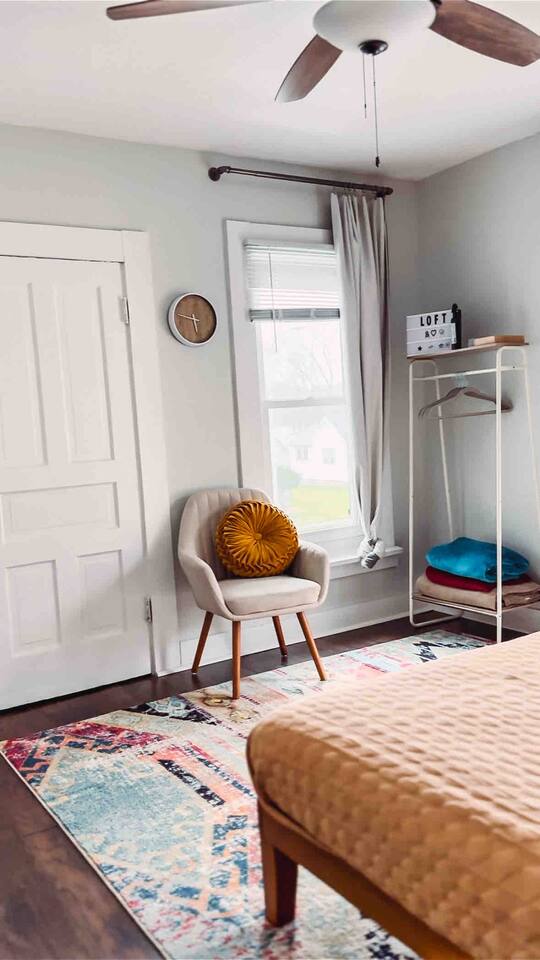 This 2 bedroom - 1 bath - loft style apartment with a mid century modern aesthetic can sleep up to 4 guests and is a short 5 minute drive to both downtown Champaign and University of Illinois making it an ideal location for your next visit to Champaign. The Loft is an upper level suite in a 100 year old Victorian-style home that has been converted into a duplex. This upstairs loft features 2 king bedrooms and a smart TV.