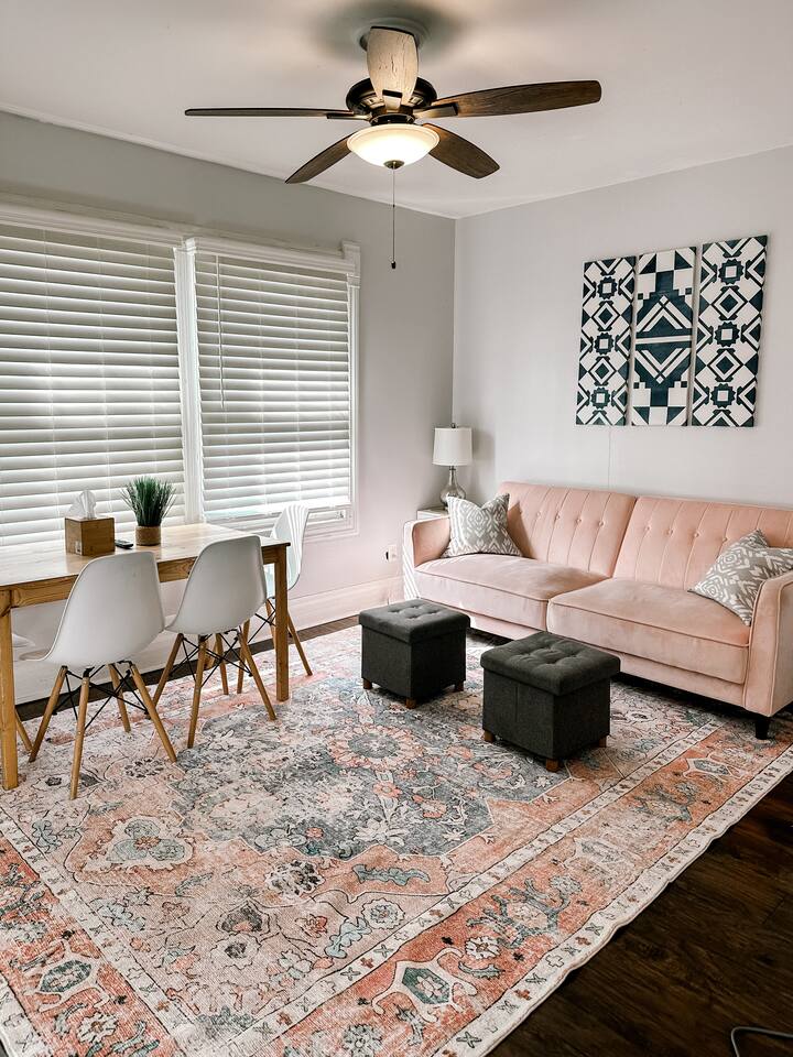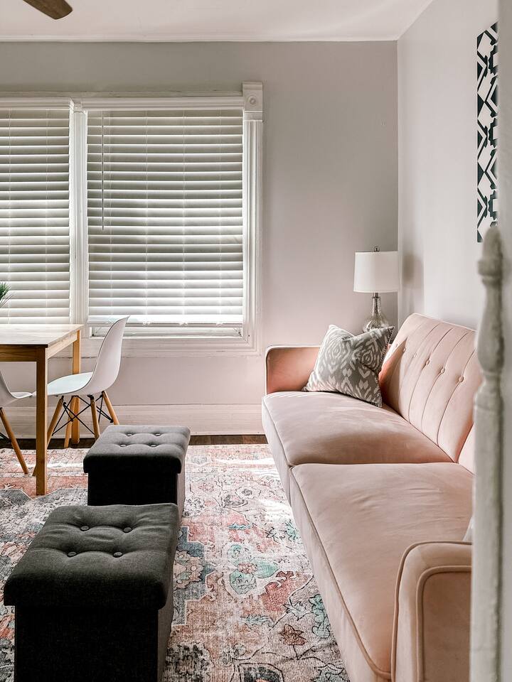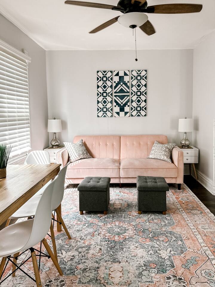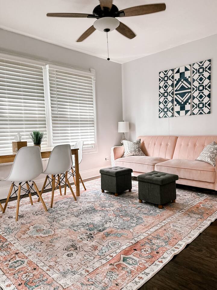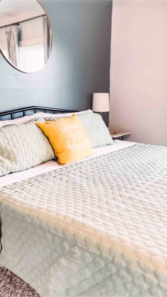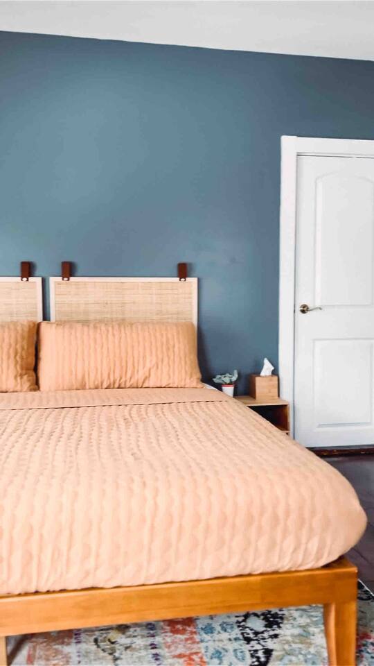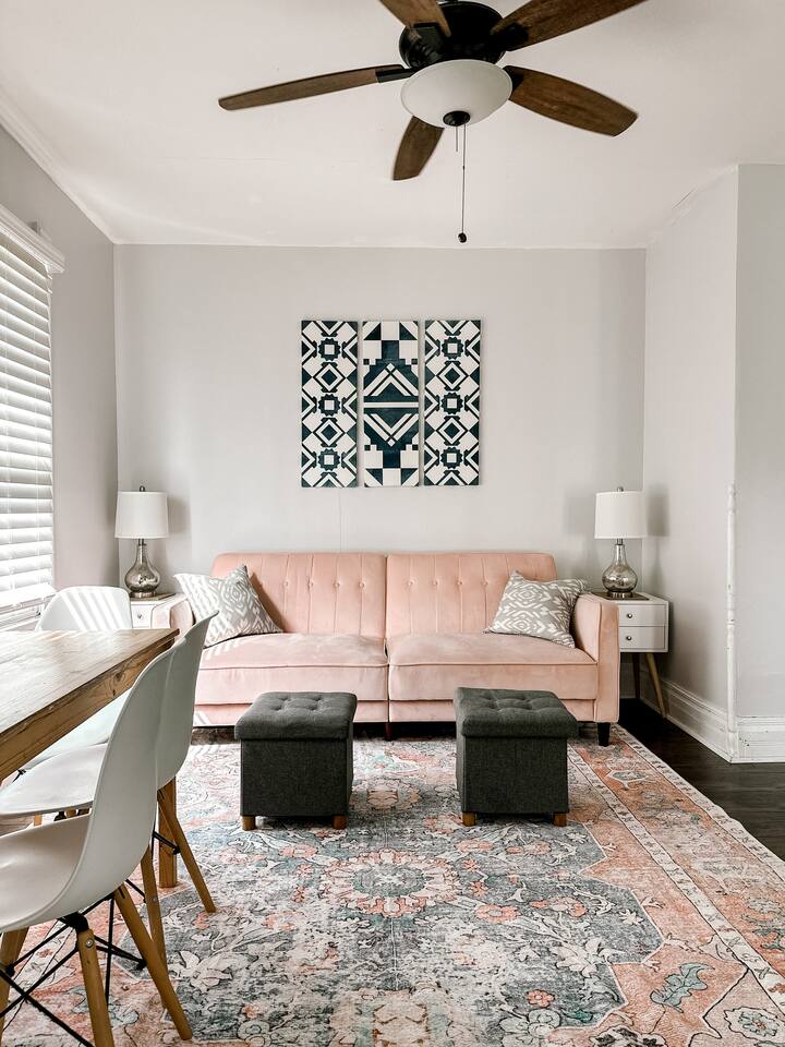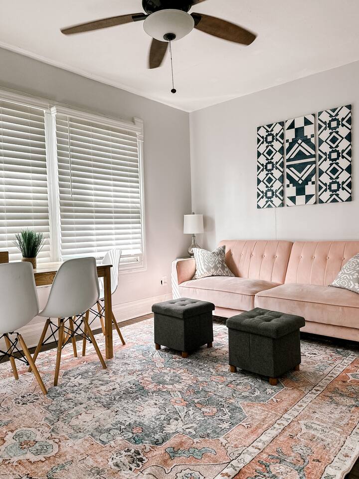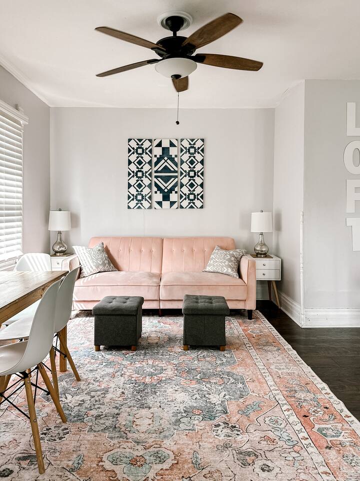 This 2 bedroom - 1 bath - loft style apartment with a mid century modern aesthetic can sleep up to 4 guests and is a short 5 minute drive to both downtown Champaign and University of Illinois making it an ideal location for your next visit to Champaign. The Loft is an upper level suite in a 100 year old Victorian-style home that has been converted into a duplex. This upstairs loft features 2 king bedrooms and a smart TV.